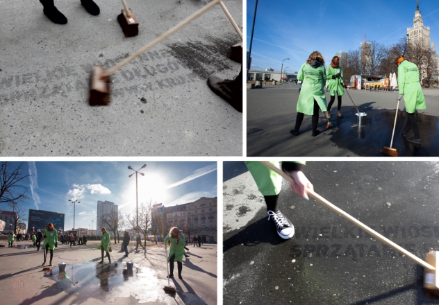 Za pośrednictwem jednego z naszych narzędzi natural media – clean ads, na chodnikach w pięciu punktach w centrum Warszawy wymyliśmy przyciągające uwagę napisy. Do ich odsłonięcia doszło 20 marca w trakcie „Wielkiego Wiosennego Sprzątania” które odbyło się w miejscach o dużym natężeniu ruchu pieszych, przyciągając uwagę wielu przechodniów i umożliwiając im interakcję.